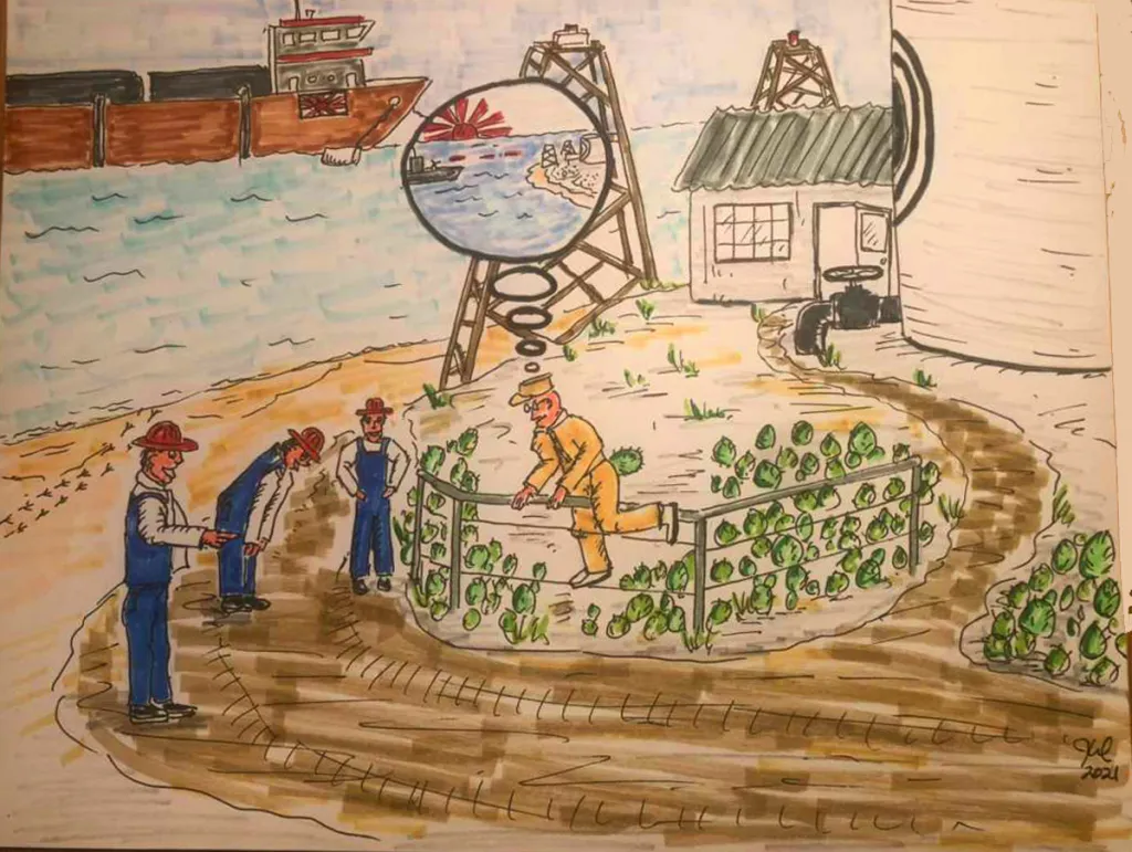 He decided to take a cutting back for his mother’s garden in Japan but when he climbed over the fence he fell into the cactus and got pretty badly stuck. Some roughneck oil workers saw him struggling and screaming, “like a little girl who lost her dolly” said one. Kozo was completely humiliated and slunk back to his his ship. He never got the cutting. It is not known if his mother was disappointed. No doubt she was, further inflaming Kozo’s desire for retribution.