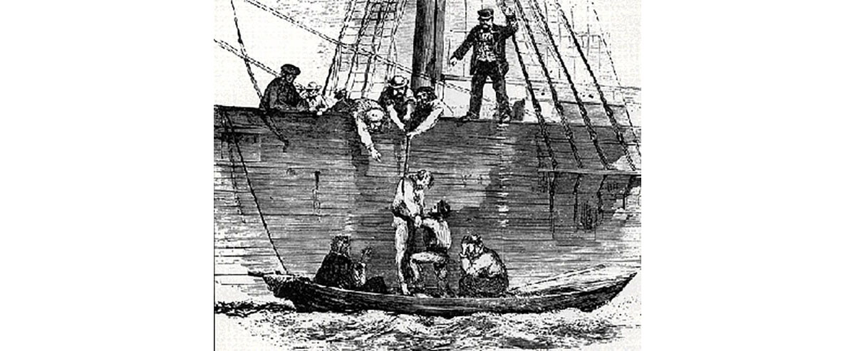 John Sutter’s ranch was serviced by Indians who were not slaves according to the US Federal Government though they were very much that. But in the 1850s another form of slavery arose, and with it the term to be Shanghaied. This was widely practiced in San Francisco and, for a change, many of those enslaved were white men. As commerce boomed in California, the need for men to crew ships became dire and desperate times encouraged unscrupulous ship captains to be…creative. The labor shortage was answered by crimps (kidnappers) who plied the saloons and boarding houses capturing hapless country lads, busted Argonauts and sailors fresh in from a long voyage.